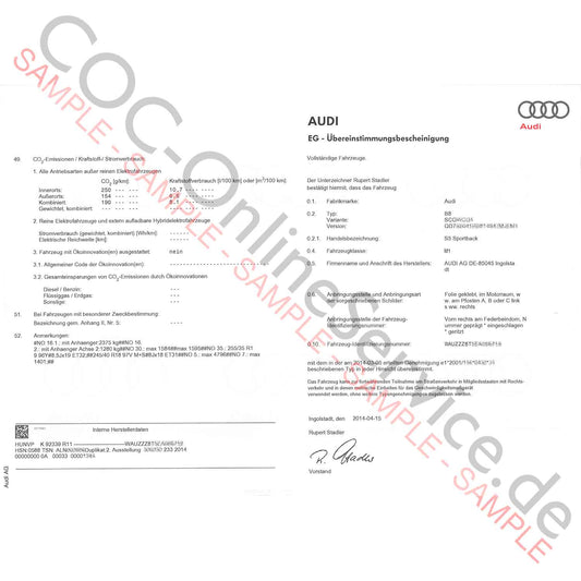COC-dokumenter til Audi (Certificate of Conformity)