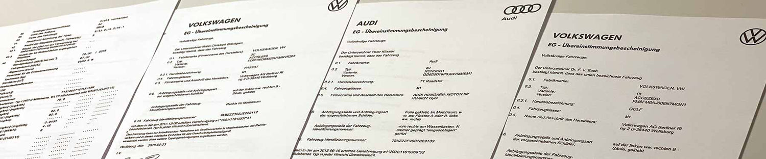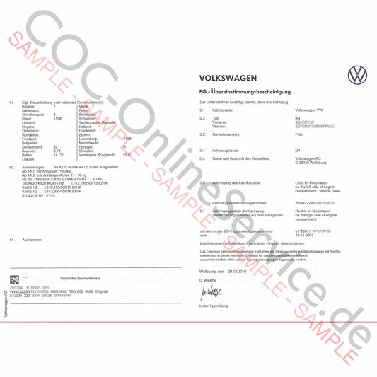 COC-dokumenter til VW Volkswagen (Certificate of Conformity)