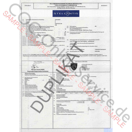COC-dokumenter til Peugeot (Certificate of Conformity)