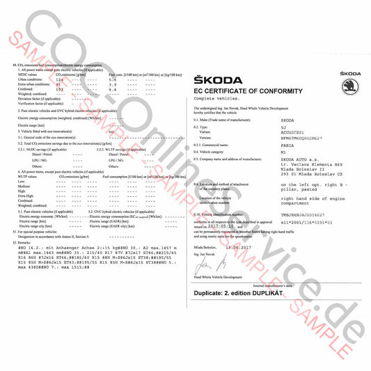 COC-dokumenter til Skoda (Certificate of Conformity)